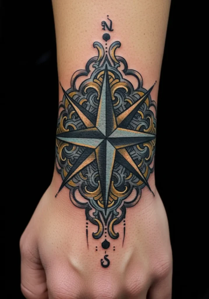 This tattoo takes the classic compass rose and gives it a major glow-up. The star-shaped compass is inked in bold gold and steel blue shades, perfectly shaded to give it that beveled 3D look. What really makes it pop is the intricate ornamental backdrop. It almost looks like fine jewelry or wrought iron scrollwork, framing the compass with swirls of muted gold and grey. It s centered right above the wrist and stretches slightly onto the hand for extra drama.