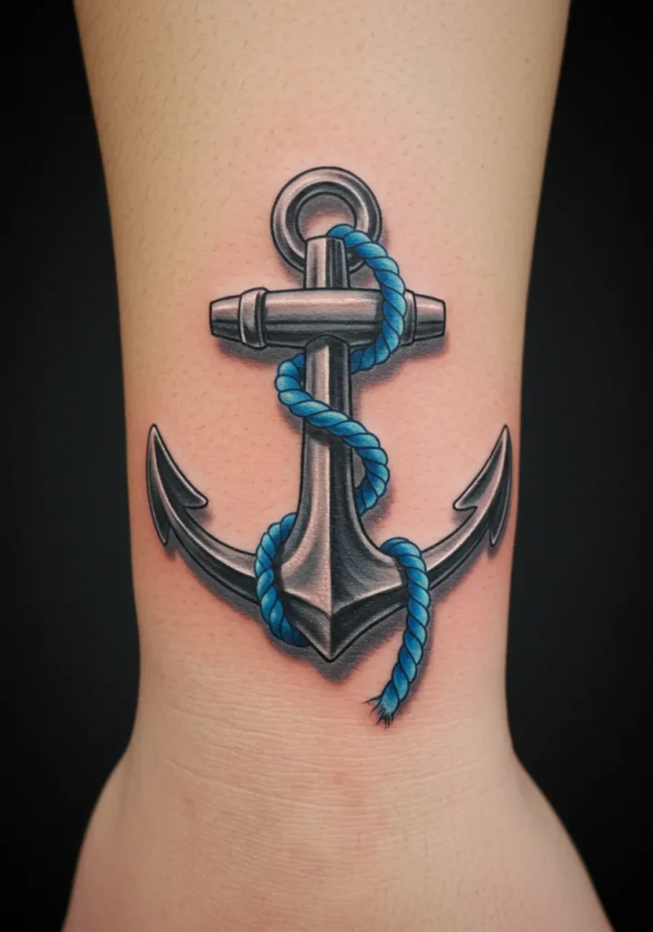 This tattoo showcases a striking 3D-style anchor wrapped in a vivid blue rope, giving it a lifelike and sculpted feel that practically pops off the skin. The shading is super crisp, with metallic gray tones and soft highlights that create depth and make the anchor look like it was forged from actual steel. The blue rope adds a fresh contrast, twisting around the anchor with realistic tension and texture that s just so satisfying to look at.
