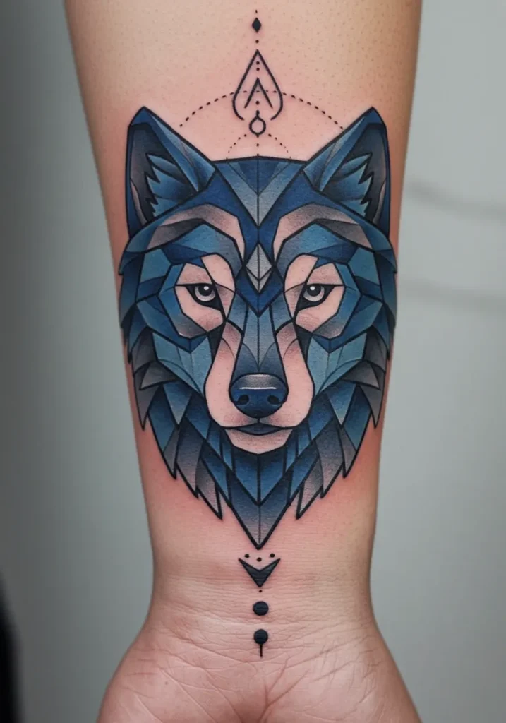 Geometric Wolf Wrist Tattoo in Blue Gradient Style