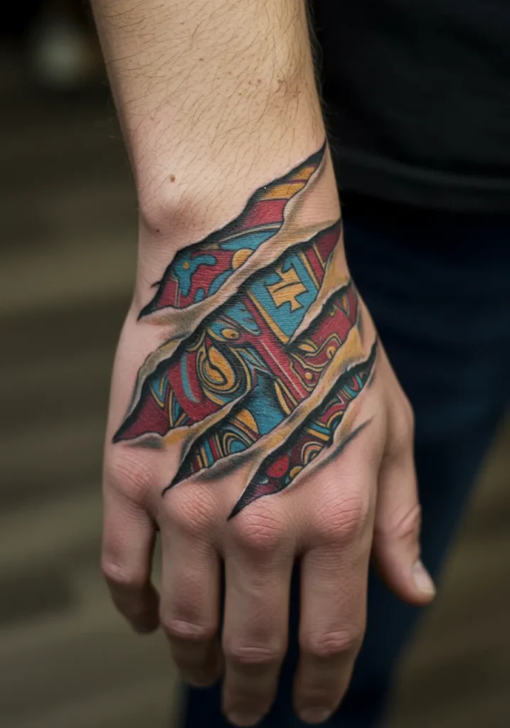 This wrist tattoo gives serious edge with its torn-skin illusion revealing vibrant tribal patterns beneath. The rips look almost three-dimensional, like claw marks peeled back the surface to expose bold geometric designs in shades of teal, red, mustard, and black. The inner design feels like a secret layer of strength or identity that s been hiding just beneath the skin.