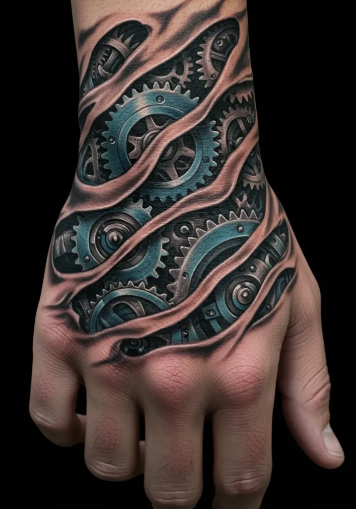 This tattoo is a wild mash-up of human and machine, with hyper-realistic gears that look like they re turning just beneath the skin. The design pulls off an intense 3D illusion, showing layers of torn flesh revealing a complex network of steel-blue and gunmetal cogs. The textures are insanely detailed, from the smooth shine of the gears to the soft shadows that give everything depth and motion. It s bold, edgy, and engineered to perfection.