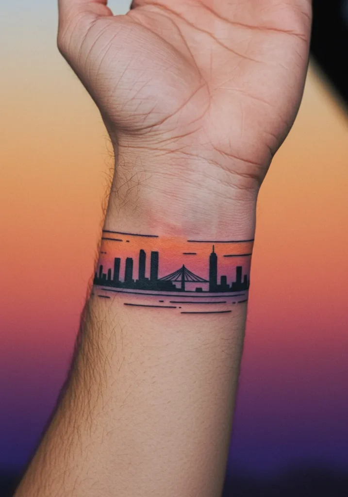 City Skyline Wrist Tattoo in Sunset Gradient Style