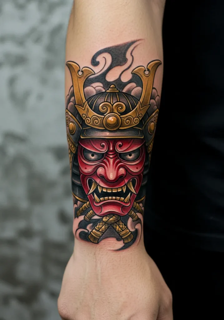 This wrist tattoo features a fierce red samurai mask with intense eyes, snarling teeth, and golden armor accents that wrap cleanly across the wrist and lower forearm. The craftsmanship is absolutely insane, from the rich shading on the helmet to the swirling smoke and crossed swords beneath. The bold red and deep black contrast beautifully with the ornate gold, giving the whole design this powerful, battle-ready presence.