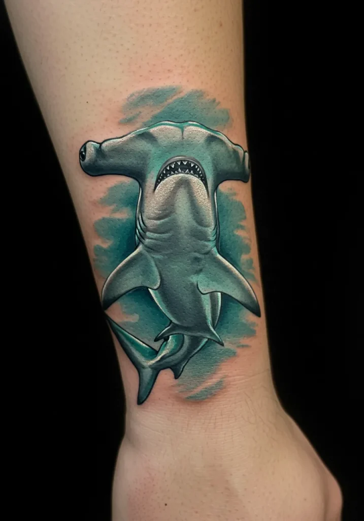 This wrist tattoo showcases a bold and beautifully shaded hammerhead shark, swimming upward through soft swirls of teal water. The unique head shape is perfectly captured, giving the shark a fierce yet surprisingly sleek vibe. The color palette is a cool mix of silver, ocean blue, and hints of deep sea green, with gentle highlights that make the entire piece look like it s glowing underwater. The placement makes it look like the shark is rising right from the wrist.