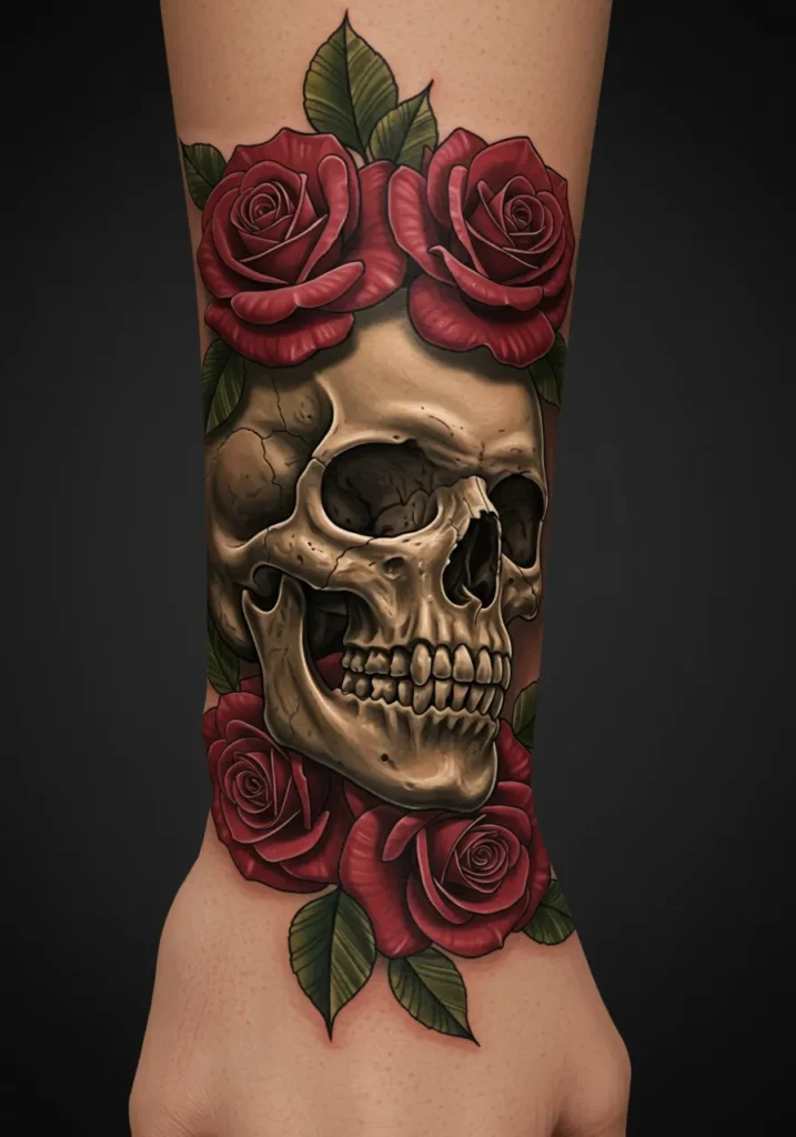 This wrist tattoo makes a dramatic entrance with a perfectly shaded human skull surrounded by deep red roses and rich green leaves. The skull itself is incredibly lifelike, with shadows tucked into every crevice and the kind of bone texture that almost looks touchable. The roses wrap around both the top and bottom, creating this gorgeous contrast between life and death, softness and grit. Everything is placed so intentionally that it forms a natural frame on the wrist and lower forearm.