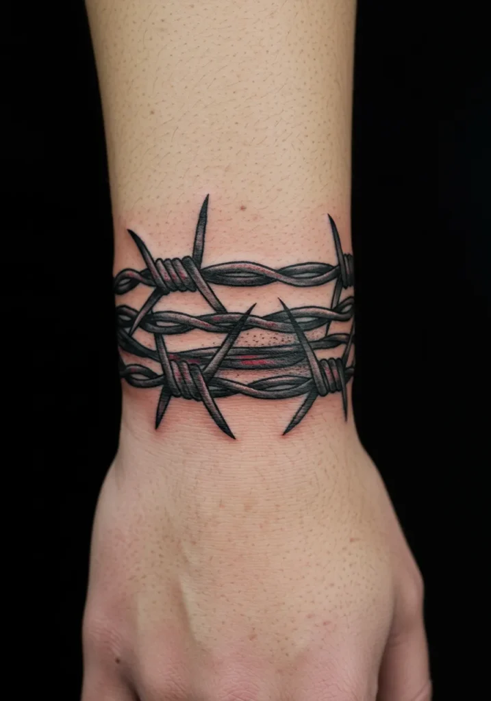 This tattoo wraps tightly around the wrist like an actual band of barbed wire. The detailing is super sharp, with perfectly placed shadows and highlights that make the wire look seriously three-dimensional. You can see the twist of each strand and the jagged tips of the barbs, all shaded with steely greys and a touch of soft redness around the skin to give it that freshly inked intensity.
