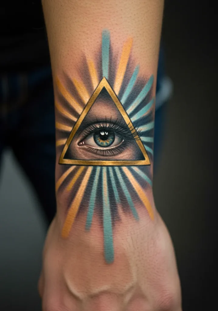 This tattoo is a total showstopper with its hyper-realistic eye nestled perfectly inside a glowing golden triangle. Rays of color shoot outward in soft gradients of teal and amber, giving the whole piece an energetic, almost mystical vibe. The eye is incredibly lifelike, framed with subtle lashes and deep shading that gives it a piercing, watchful presence right at the center of the wrist.