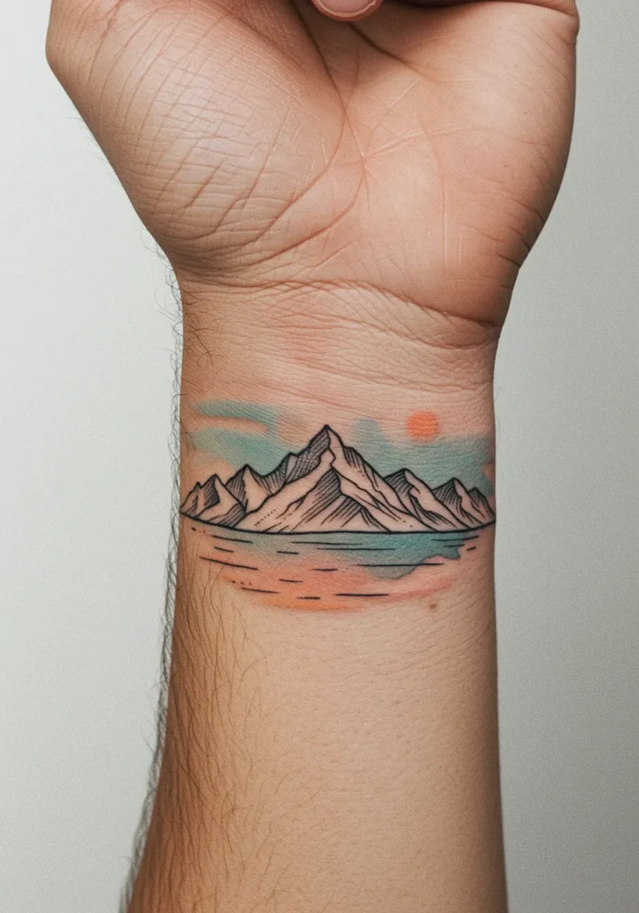 This tattoo wraps gently around the wrist with a dreamy little mountain scene that looks straight out of a watercolor sketchbook. The mountains are drawn with fine black lines for structure, while the sky and water shimmer in soft tones of coral, mint, and dusty blue. A tiny orange sun rests above the peaks, casting just the right amount of warmth across the piece. It s delicate, balanced, and surprisingly calming to look at.