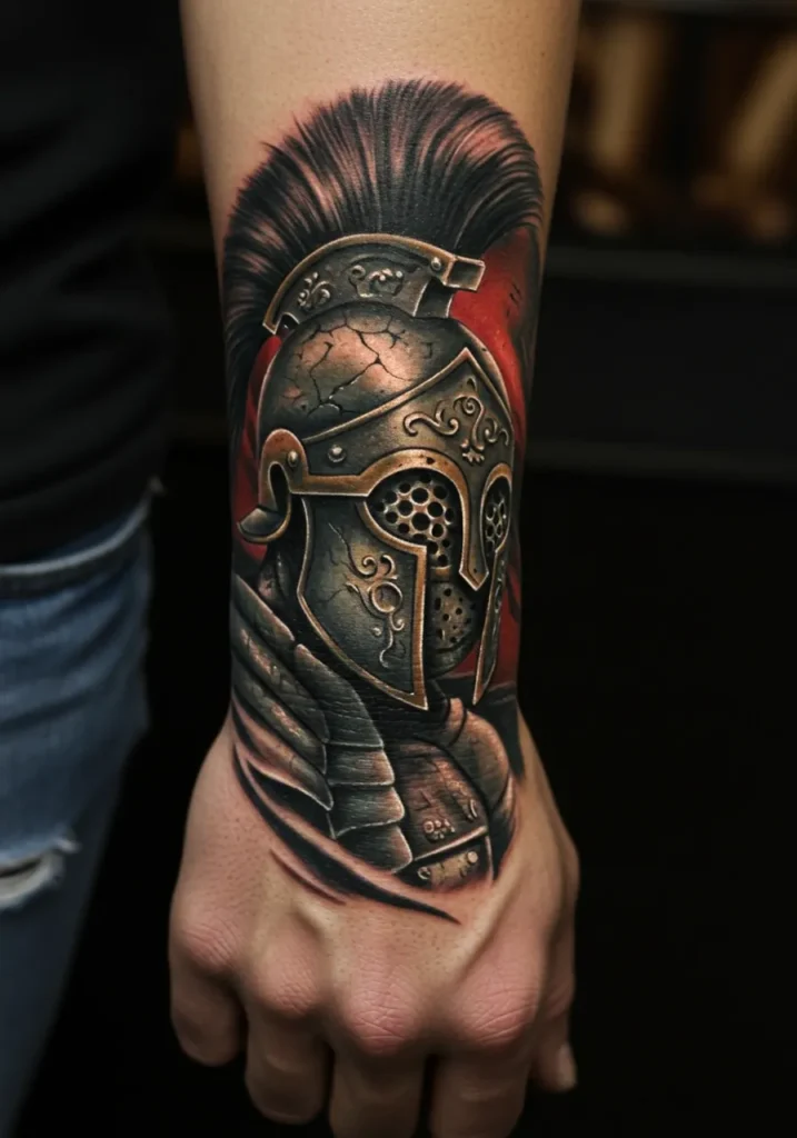 This incredible wrist tattoo brings a Roman warrior to life with jaw-dropping realism. The helmet is loaded with detail cracks, etchings, shadows and the brushed metal texture is so convincing it almost looks wearable. The deep red plume flowing upward adds a dramatic flair, while the layered armor and moody lighting make the entire piece feel like a scene from an epic film. It sits perfectly along the forearm and wrist, creating a powerful wraparound effect.