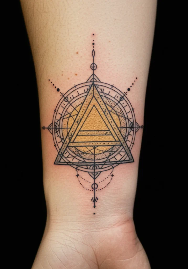 This eye-catching wrist tattoo centers around a bold golden triangle surrounded by intricate geometric linework that forms circles, arcs, and ornamental dots. The lines are super clean and sharp, creating an almost mandala-like symmetry that feels both spiritual and scientific. The golden fill in the triangle adds a subtle shimmer that contrasts beautifully with the surrounding fine black ink.