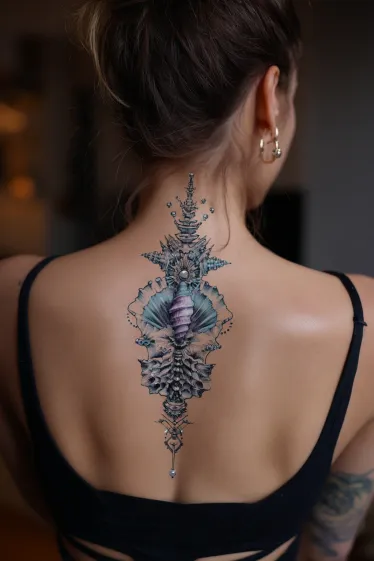 This tattoo features a detailed seashell as the centerpiece, framed by delicate coral branches and ornamental accents that trail perfectly along the spine. The muted tones of lavender and teal bring the seashell to life, while the fine line details in the coral add depth and texture. The entire piece feels like a little underwater shrine, beautifully balanced and feminine.