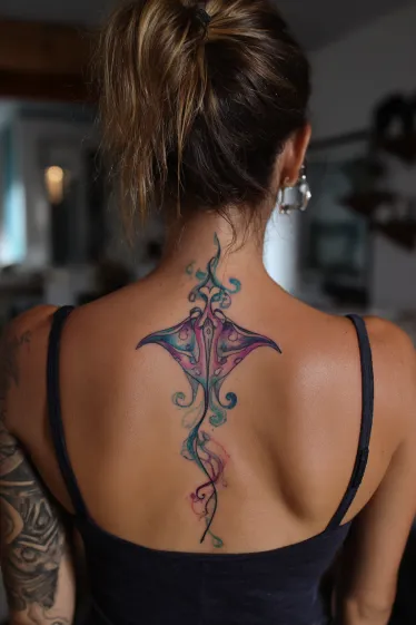 This tattoo showcases a vibrant manta ray centered along the spine, its wings spreading outward in shades of purple and pink with intricate ornamental details woven inside. Flowing lines extend downward in teal and blue, giving the design a sense of movement and connection along the back. The mix of bold color and delicate linework makes the manta ray look both graceful and powerful, almost like it s gliding through water.