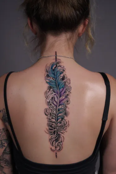 This tattoo features a long feather placed vertically along the spine, blending soft ocean-inspired colors like teal, blue, and hints of purple. The feather is surrounded by swirling details that resemble waves, giving it both texture and movement. The fine linework adds elegance while the watercolor shading brings in a dreamy, fluid effect that ties the design beautifully to the theme of the sea.