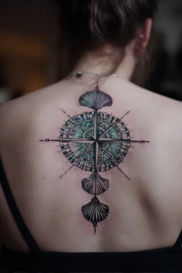 I really like this tattoo because it feels like the perfect mix of guidance and ocean magic. The compass speaks to finding direction, while the shells tie it to the sea in such a graceful way. To me, it feels like carrying a little piece of wanderlust on your back, and I think the combination of structure and softness makes it such a standout design.