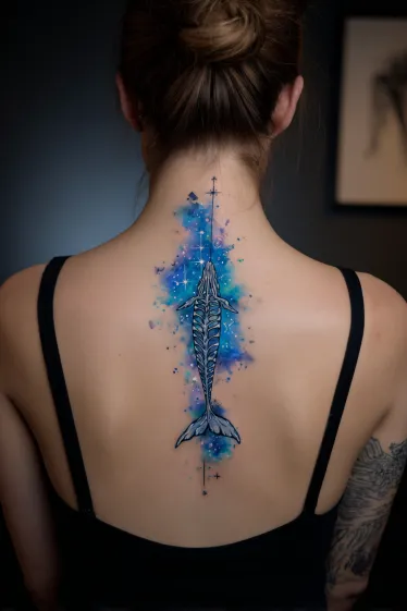 This tattoo showcases a majestic whale stretching vertically along the spine, with its body outlined in fine detail. Surrounding the whale is a dreamy watercolor background of deep blues and purples, sprinkled with star-like accents that give the whole design a celestial, ocean-meets-sky feel. The placement enhances the whale s graceful shape, making it look as though it s gliding effortlessly through an endless sea.