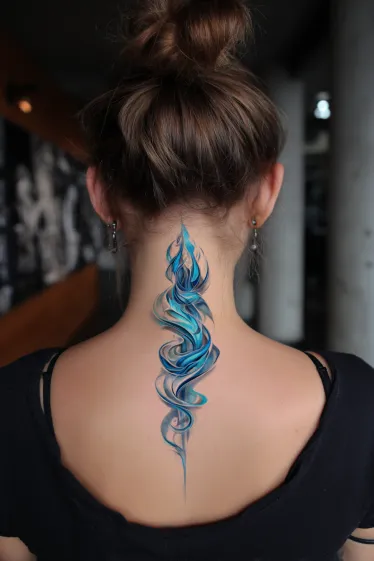 This tattoo features a sleek design of swirling blue waves that cascade gracefully down the spine. The curves are soft and fluid, giving the impression of water in constant motion. The use of layered shades of blue creates depth and shine, making the design look almost three dimensional. It sits beautifully in the center of the back, following the natural line with elegance.