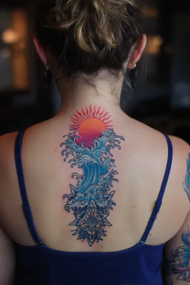 This tattoo runs beautifully along the spine, with rolling blue waves climbing upward toward a radiant sun in glowing shades of pink and orange. The water is filled with movement and detail, cascading into foamy peaks that seem alive with energy. At the base, the design transitions into a more intricate, ornamental pattern that adds balance and depth, making the whole piece feel both powerful and graceful.