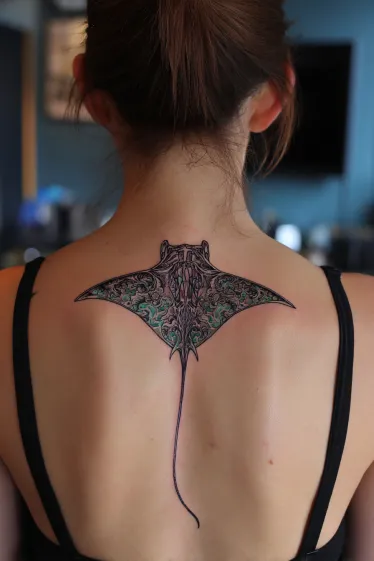 This tattoo features a graceful manta ray stretching its wings across the upper back, with its long tail flowing naturally down the spine. The design is filled with intricate ornamental patterns in shades of green and purple, giving the manta ray an almost mystical aura. The delicate linework creates a lace-like effect that makes the tattoo feel both bold and feminine at the same time.