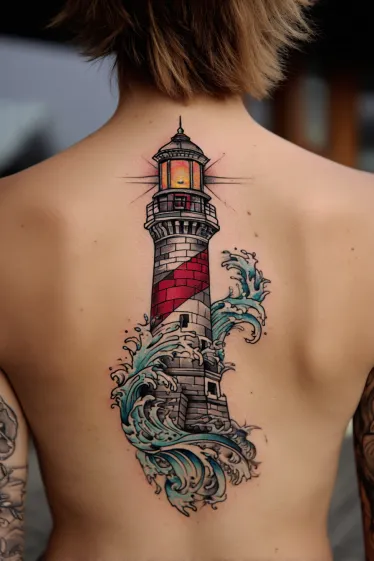 This tattoo showcases a tall lighthouse standing strong along the spine, wrapped in rolling teal waves that crash against its stone base. The design uses bold outlines and rich shading, with a striking red stripe spiraling up the tower. At the top, the glowing lantern shines with warm golden tones, creating a beautiful contrast against the cool blues of the sea. The vertical placement makes the lighthouse feel even taller, giving the tattoo an impressive presence down the back.