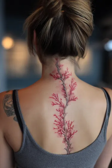 This tattoo flows down the spine with delicate coral branches in vibrant shades of red and pink. The design follows the natural curve of the back, creating the look of an underwater plant swaying gently with the tide. The thin black spine-like detail running through the center ties it all together, giving the coral a lifelike appearance while keeping the tattoo soft and feminine.