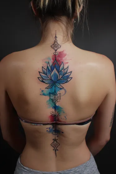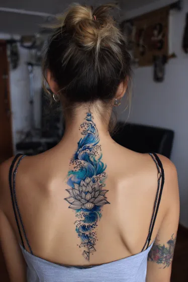 I think this tattoo is beautiful because it combines the calm, symbolic nature of the lotus with the fluid energy of the ocean. The watercolor splashes make it feel alive, like waves of color washing over the skin. To me, it feels like a design that radiates strength and serenity at the same time, and I love how it transforms the spine into such a striking focal point.