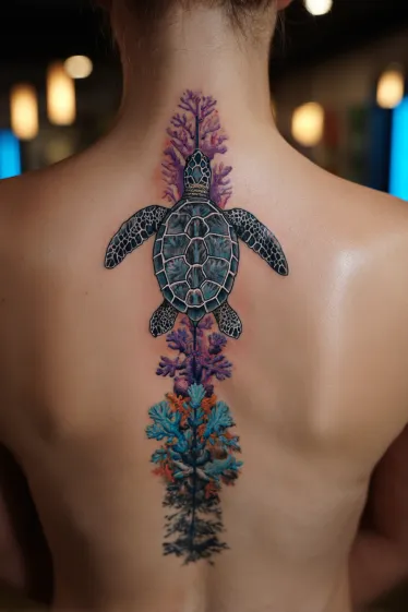 I find this tattoo so captivating because it tells a story of ocean life in a single design. The turtle represents wisdom and endurance, while the reef adds a dreamy burst of color that feels alive. I love how the design stretches naturally with the spine, almost as if the wearer is carrying a slice of the ocean with her everywhere she goes. It s such a stunning and meaningful way to celebrate the sea.