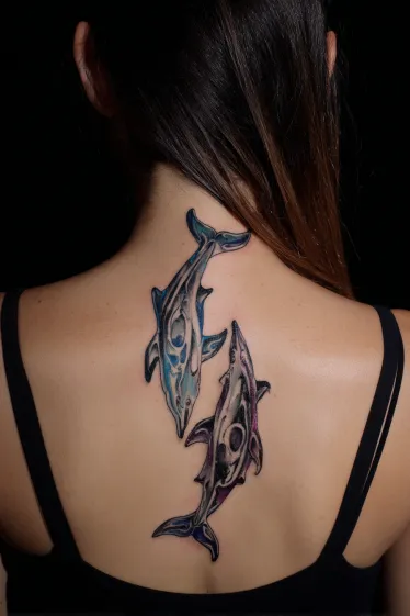 This tattoo features two dolphins gliding down the spine, each detailed with abstract patterns that make them feel almost mystical. The blue and purple tones give them a shimmering effect, like light reflecting underwater. Their positioning creates a natural flow along the back, with one dolphin curving upward and the other gently angled downward, almost as if they are dancing together in the ocean.