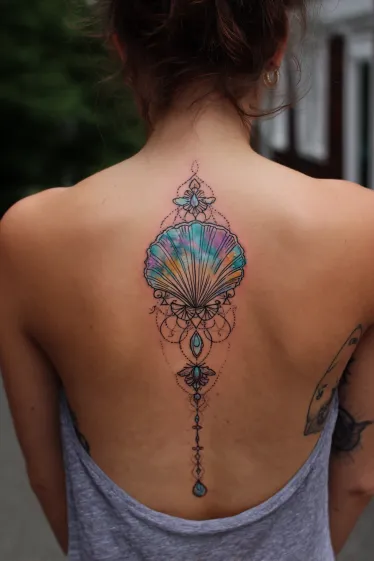 This tattoo highlights a radiant seashell centered on the spine, detailed with soft pastel hues of turquoise, pink, and gold that shimmer like a sunrise over the ocean. The seashell is framed with elegant ornamental patterns that cascade vertically up and down the back, connecting with delicate gemstones and lace-like elements. The design feels feminine and graceful, almost like a piece of jewelry permanently resting against the skin.