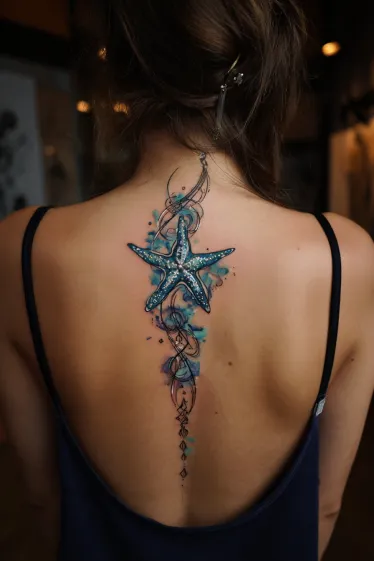 This tattoo features a striking starfish placed at the center of the spine, brought to life with shimmering shades of turquoise and ocean blue. Fine details in the arms of the starfish make it look textured and realistic, while the surrounding splashes of watercolor ink and flowing ornamental accents create a sense of movement. The design trails downward with delicate lines and dots, making it both bold and graceful.