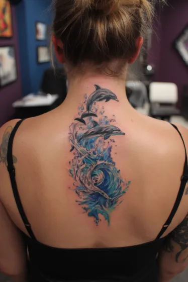 This tattoo captures two dolphins leaping joyfully above a swirling wave that flows down the spine. The wave is designed in vibrant blues with hints of purple and white, giving it a lively, foamy texture. The dolphins are detailed and realistic, adding a sense of movement that makes the whole piece feel alive and full of energy. Positioned perfectly along the back, the design creates a vertical scene that feels balanced and natural.