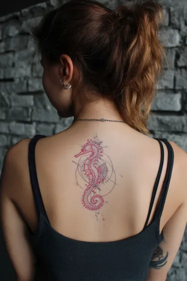 This tattoo features a delicate seahorse positioned vertically along the spine, drawn in soft red and pink tones that make it stand out beautifully against the skin. Fine line geometric circles surround the seahorse, giving the design a modern and balanced look. The detailed scales and curled tail add a touch of realism, while the lightness of the linework keeps the tattoo elegant and feminine.