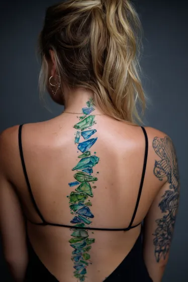 This tattoo runs along the spine with a vertical arrangement of sea glass pieces in shimmering shades of blue and green. Each fragment is shaped uniquely, layered together to form a flowing, natural pattern that almost looks like jewels scattered by the tide. The watercolor shading adds a translucent effect, making the design glow as if light is passing through the glass.