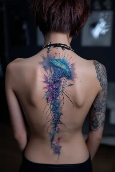 This tattoo stretches beautifully along the spine with a glowing jellyfish at the top, its tentacles flowing downward in delicate strands of purple, pink, and blue. The watercolor style adds a dreamy effect, making the jellyfish look as if it s floating through an underwater current. Soft splashes of color radiate around the design, giving it movement and depth that perfectly complements the natural line of the back.