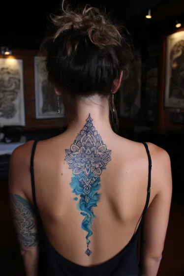 This tattoo features a stunning mandala design at the center of the spine, with delicate lines and layered patterns that radiate out like ocean ripples. Shades of deep blue and teal flow down in a watercolor effect, creating the look of waves spilling gently beneath the mandala. The combination of structured geometry and free-flowing watercolor makes the tattoo both intricate and dreamy, perfectly suited for the back.