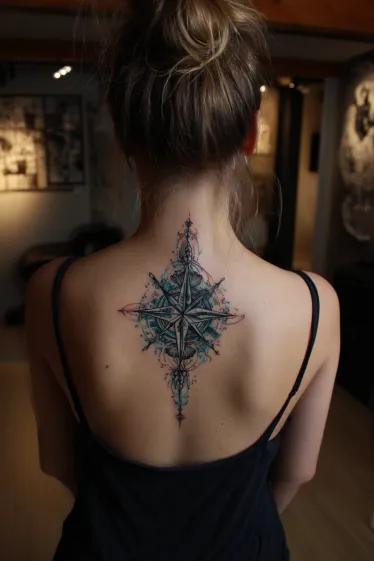 This tattoo shows a beautifully detailed compass stretched across the upper spine, decorated with ocean-inspired shades of teal and blue. The fine linework creates sharp points and symmetrical flourishes, while watercolor splashes soften the look with a dreamy effect. The placement makes the compass feel perfectly centered, drawing attention to the natural line of the back while keeping the design balanced and elegant.