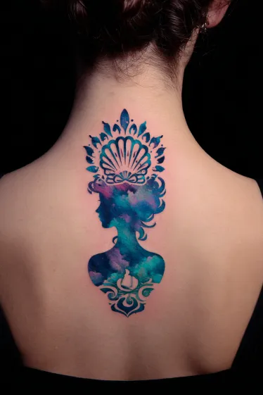 This tattoo shows the graceful silhouette of a mermaid flowing down the spine, filled with watercolor shades of blue, green, and purple that give it a dreamy, ocean-inspired effect. At the top, a seashell crown framed by ornate detailing adds a regal touch, while decorative patterns at the base bring balance and symmetry to the design. The mix of bold lines and soft watercolor blending creates a striking contrast that feels both artistic and feminine.