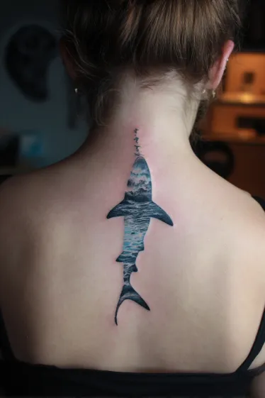 This tattoo features a bold shark silhouette running down the spine, filled with ocean waves that give it depth and movement. The design uses negative space to create a striking effect, blending the outline of the shark with the texture of the sea inside its body. Positioned vertically, it follows the natural line of the back, making it both eye-catching and perfectly suited for the spine.