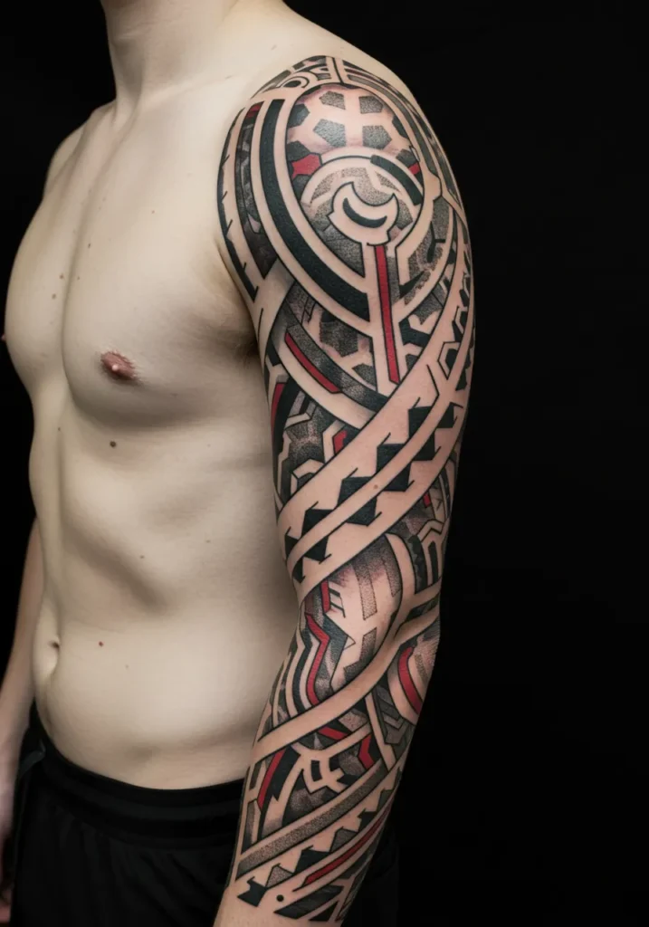 This bold geometric sleeve tattoo brings modern edge and tribal influence together in such a cool and eye-catching way. The design wraps tightly around the entire arm, packed with sharp lines, intricate shapes, and striking negative space. Rich blackwork is paired perfectly with subtle red highlights, giving the whole piece just the right pop of color without losing that strong, structured feel. The pattern flows smoothly from shoulder to wrist, almost like armor, with dotwork shading that adds depth and texture.