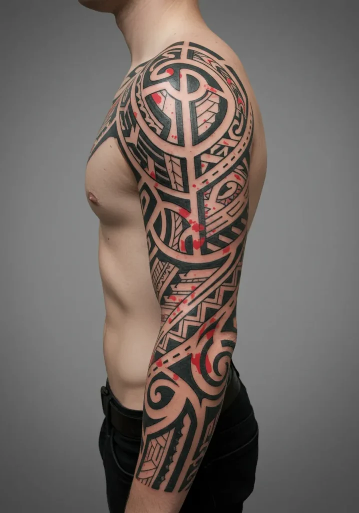 This striking sleeve tattoo showcases bold Polynesian tribal patterns, weaving together thick black lines, geometric shapes, and intricate detailing that flows effortlessly across the arm. Subtle red accents are splashed throughout the design, adding just the right amount of edge and drama without overpowering the traditional elements. The symmetry is absolutely gorgeous, with the patterns wrapping around the shoulder and down to the wrist in a way that feels balanced and powerful.