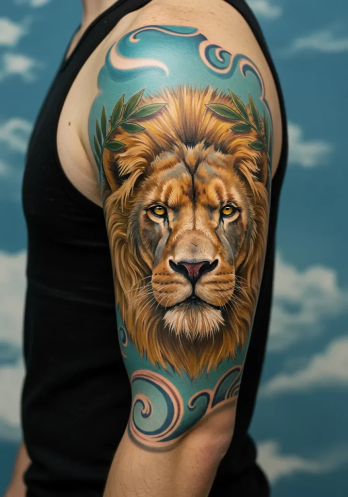 This gorgeous upper arm tattoo features the regal face of a lion, brought to life with jaw-dropping realism. Every detail of the golden mane feels soft and wild at the same time, with those sharp amber eyes locking you in with their intense gaze. Framing the lion s head are delicate green olive branches, adding a soft, earthy contrast against the sky-blue background swirled with artistic waves. The mix of bold colors and fine shading gives the entire piece so much depth and dimension.