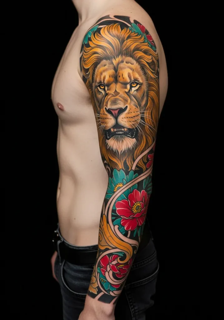 This striking sleeve tattoo showcases a majestic lion with a flowing golden mane, framed by bright red flowers, teal leaves, and elegant swirling patterns. The lion s intense gaze is front and center, full of confidence and power, while the floral elements soften the look just enough to keep it beautifully balanced. The bold use of color and crisp lines make every detail pop, giving the entire piece such a polished and dramatic feel.