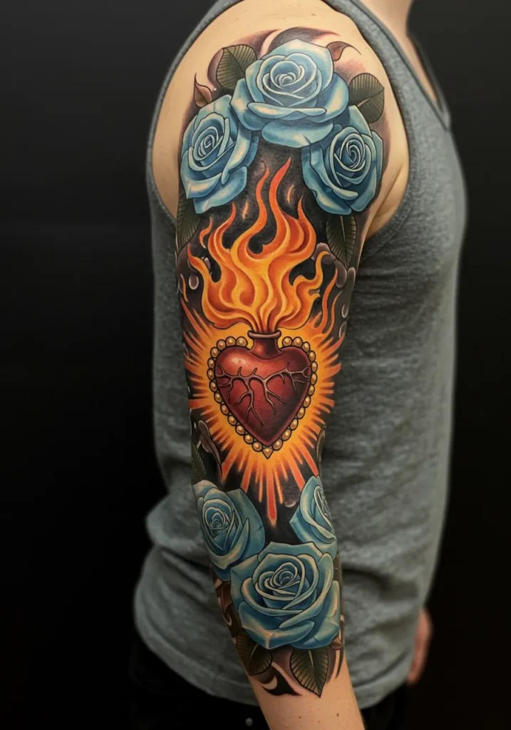This gorgeous sleeve tattoo features a stunning sacred heart wrapped in radiant flames, glowing with bold oranges, yellows, and reds. Surrounding the heart are soft blue roses, their delicate petals standing out beautifully against the darker background. The balance between the fiery passion of the heart and the cool calm of the roses makes the entire piece feel dramatic but also full of grace. The detailed shading and smooth color transitions give the tattoo so much dimension and life.