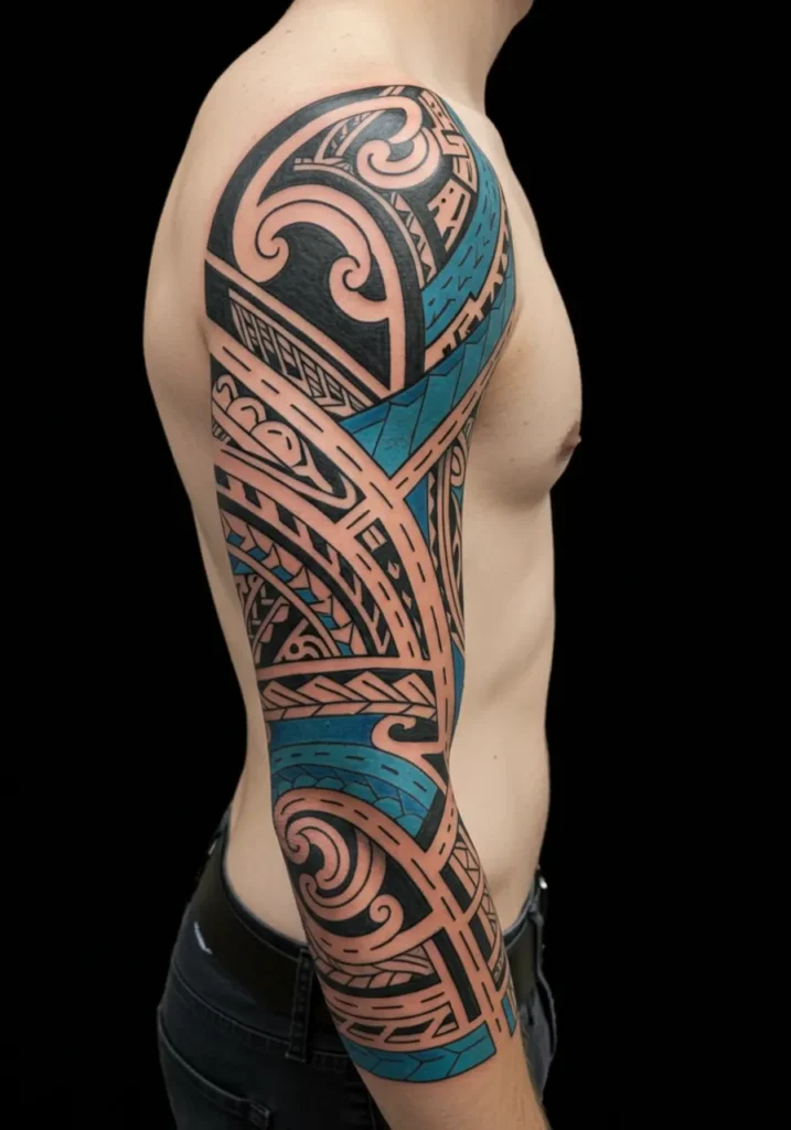 Polynesian Tribal Sleeve Tattoo With Blue Accents