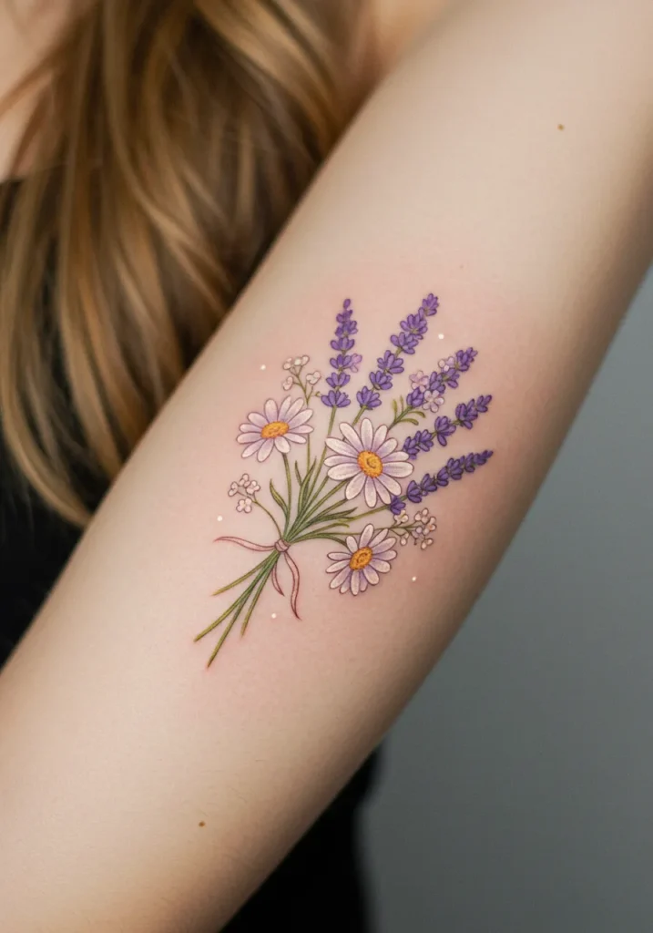 What I absolutely love about this tattoo is the combination of flowers that feels so harmonious. The way the lavender and daisies are arranged together, with the lightness of the colors and the soft, flowing lines, creates a lovely, organic look. It s the perfect tattoo for someone who loves flowers and wants something that s beautiful but not overly bold. The soft colors and fine details make it feel like a natural part of the body like a personal garden blooming right on your skin.