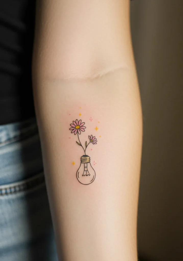 This adorable tattoo features a daisy blooming inside a light bulb, symbolizing the fusion of nature and creativity. The fine line art highlights the simplicity of the design, with the daisy s soft petals contrasting against the minimalist light bulb. The addition of a few sparkles around the flowers adds a playful touch, making the tattoo feel whimsical and lighthearted. The soft pastel colors of the daisy give it a charming, gentle vibe, making it perfect for anyone who loves unique, nature-inspired tattoos with a creative twist.