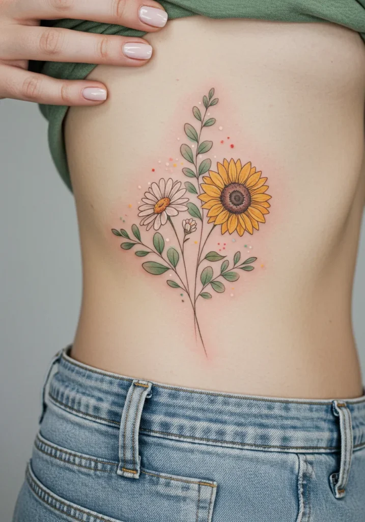 This charming tattoo beautifully combines a daisy and a sunflower with delicate fine line work, forming a perfect balance of vibrant colors and soft detailing. The daisy, with its crisp white petals and yellow center, stands alongside the rich golden yellow sunflower, their stems elegantly entwined with fresh green leaves. The soft orange and yellow dots surrounding the flowers add a touch of whimsy, making the design feel light and magical. Placed on the side of the ribcage, this tattoo exudes a feminine and graceful charm.