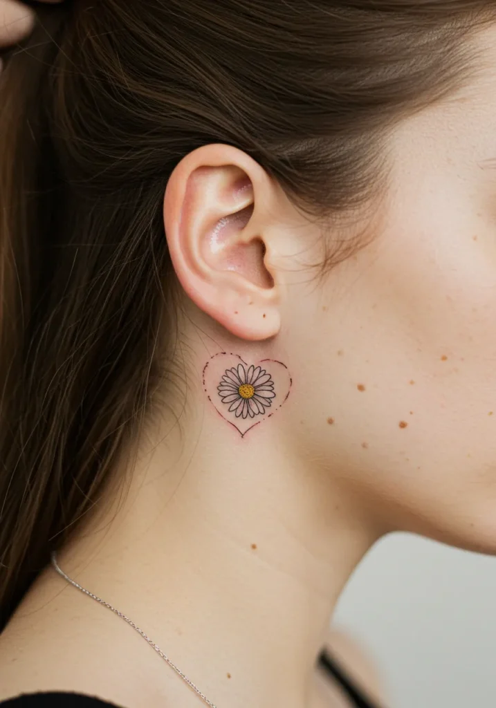 What I absolutely love about this tattoo is its sweet simplicity. The combination of the heart and daisy creates a design that s both delicate and meaningful, representing love and beauty in such a soft, artistic way. The fine lines and subtle use of color make it feel airy and fresh, and the placement just behind the ear gives it an intimate and personal feel. It s a wonderful choice for anyone who loves floral tattoos but wants something a little more understated and modern. It s cute, feminine, and a true showstopper in its subtlety!