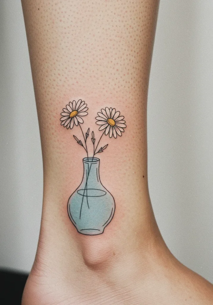 This charming tattoo features two vibrant daisies in a simple, modern vase. The fine line work captures the delicate nature of the flowers, while soft pastel colors bring the daisy petals and the vase to life. The blue vase provides a calming contrast to the yellow and white flowers, and the subtle details of the thin stems and small leaves add a touch of elegance. The design feels light, fresh, and effortlessly beautiful, making it a perfect choice for those who adore minimalist yet meaningful tattoos.