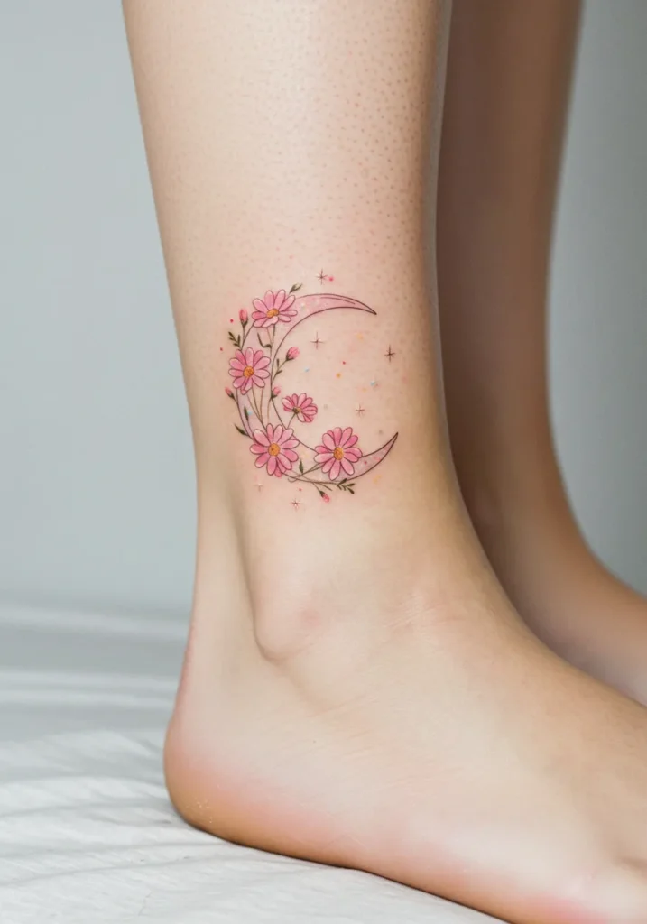 This fine line tattoo combines the soft elegance of daisies with the celestial beauty of the moon. The crescent moon is intricately intertwined with delicate, pink daisies and light green stems, creating a gentle, balanced look. The tattoo is dotted with subtle bursts of color, adding a dreamy, whimsical touch. It s both minimalistic and enchanting, with the flowers symbolizing purity and new beginnings, while the moon brings a sense of mystery and calm.