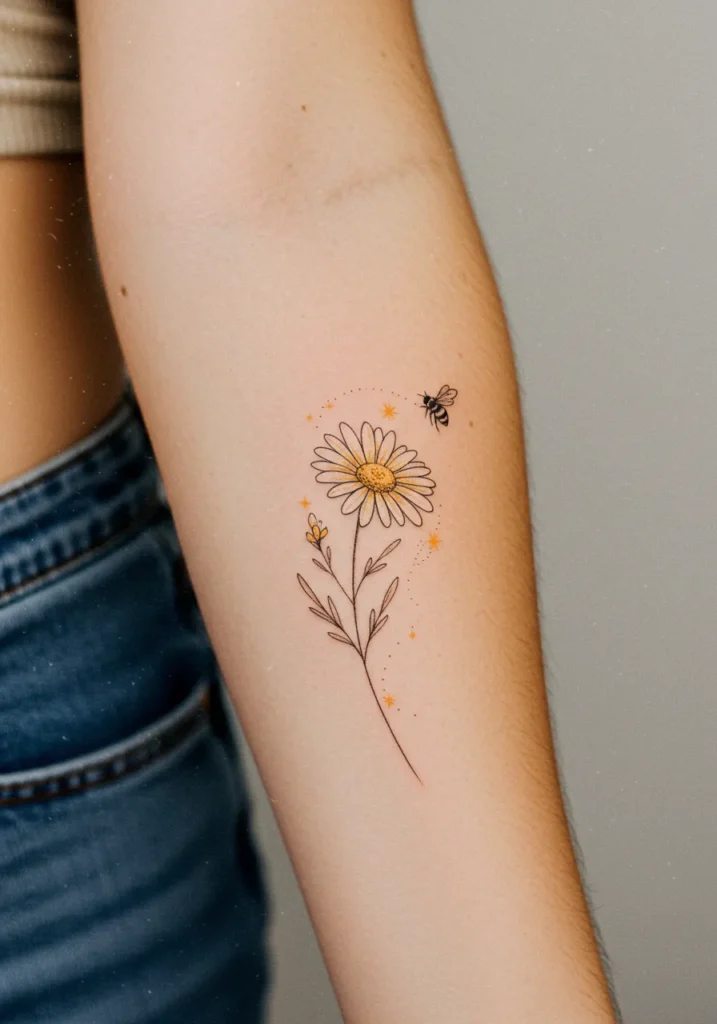 This beautiful tattoo features a daisy blooming with delicate fine lines, complemented by a tiny bee flying nearby. The daisy s soft white petals and yellow center are framed by graceful green leaves, while the bee adds a touch of life to the design. Soft, swirling lines of stars and dots float around the tattoo, giving it a whimsical and magical feeling. Placed on the inner forearm, this tattoo feels light, airy, and full of charm.